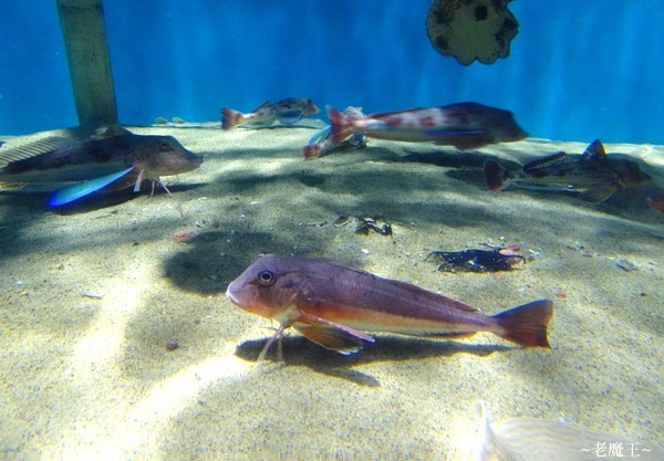 這個水族館不算大, 但收集了不少很特別的魚. 這一隻魚的側鰭展開來是彩色的, 而且還特化出三隻腳, 可以用來走路! (日文寫 "鬼の魚")