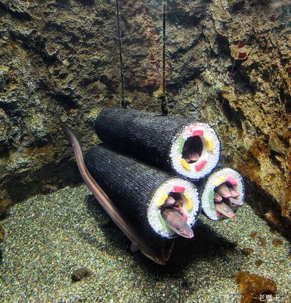有一缸鰻魚, 布置的好可愛, 做成壽司狀. 而這些鰻魚按照天性, 也都喜孜孜地鑽進去, 把自己變成鰻魚壽司!