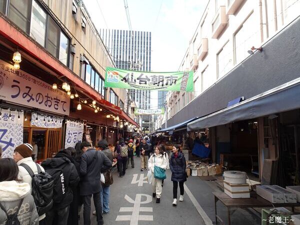 餐後, Elton 去買 "手機睡袋", 我們則在有名的仙台朝市逛逛, 淑珠又忍不住買了生蠔來吃.