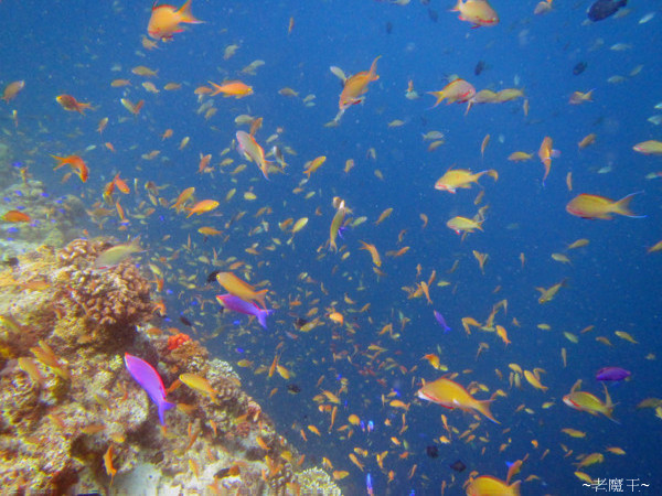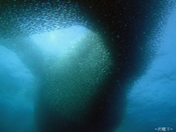 甫下水, 發現水況不好, 能見度只有 15 公尺左右! 但才游個幾分鐘, Usel 做手勢往上比; 我順勢看上去, 只見黑壓壓一片壟罩水面, 正納悶著 "這是甚麼啊?" 的時候, 突然, 黑雲泛成一片亮光, 讓我清楚看到組成這黑幕的每一條身影! 啊~ 這就是沙丁魚群呀!