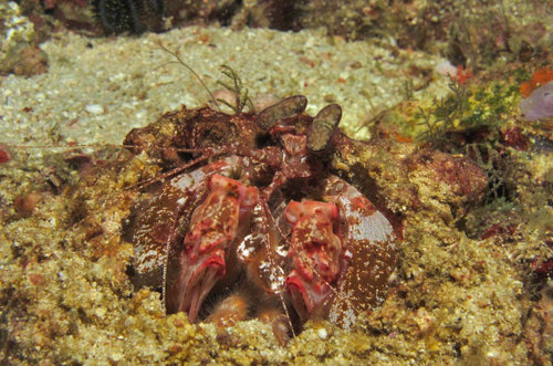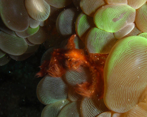 紅毛猩猩蟹我拍了幾張都很模糊, 本來想說就等海洋精靈的照片好了; 不料她竟然擺了個大烏龍, 相機的畫數調到最低, 導致拍出來的照片看似清楚, 但稍微一放大, 便整個模糊! 結果我比對了一下, 發現這一隻紅毛猩猩蟹, 反倒是老花眼很嚴重的 Q 媽拍得最好!