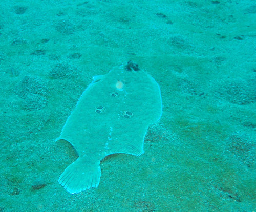 我們游泳過去, 帶起的水流, 常常會驚嚇到水底生物. 這一隻比目魚本來好好地躺在沙裡, 我根本沒看到牠; 但我在靠近牠時, 可能牠感到一股殺氣撲身而來吧, 竟突然游動起來, 還把我嚇了一跳, 呵呵!