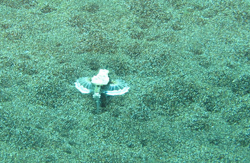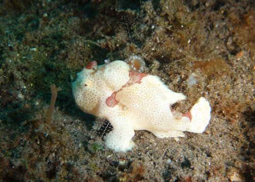 這一隻小小白白的生物, 是俗稱娃娃魚的白斑躄魚. 牠的側鰭很像兩隻腳, 會用來站在岩石或珊瑚上. 我們第一天潛水時, 有看過黑色大隻的躄魚, 這一隻顯然還是小娃娃, 比大隻的可愛多了.