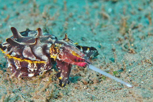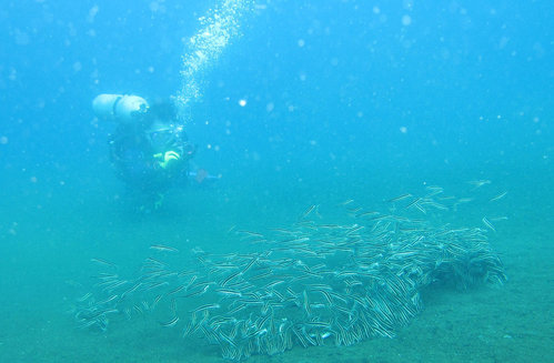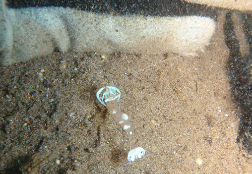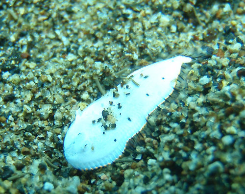 接下來看到前面眾人圍成一圈, 我趕忙游過去, 只見一隻暗紫色, 扁扁的生物, 大約 10 公分長, 在沙地上游走. 偶爾會從口中迅速射出一條長長的舌頭, 不曉得吃到了什麼東西.