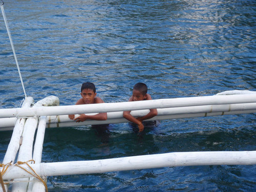 今天我們的第一個潛點是 pyramid, 在下水前, 當地的小朋友很好奇地游到我們螃蟹船, 抓住長桿看著我們 (後來莊大哥下水去找他們玩, 他們反而害羞地立刻游回岸邊).