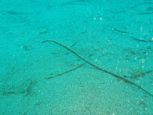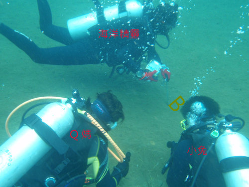 我準備要踢上水面時, Q 媽突然敲起氣瓶, 我便又下沉游過去, 原來她是要我們看一隻比較大隻的海龍. 在看過這麼多具有特色的小生物後, 這一隻海龍已經引不起我們的興趣了, 尤其剛剛才看到一隻金黃色, 很難對焦的海龍, 但大家還是隨便拍一下照片, 以示對 Q 媽的尊重與感謝, 呵呵. (根據 Q 媽多年後的回憶錄, 她當時在海裡, 清楚地聽到有人喊出 “茄~~” 這個字, 還拉著長音, 表示對她的海龍嗤之以鼻, 害她傷心了好一段時間!)