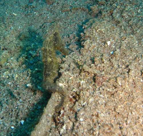 一下潛入水, 看到的海底竟然是荒蕪的沙地. 我正想著, 在這裡是能看到什麼東東啊? 不料, 立刻就在前方看到一隻黑黝黝的庫達海馬.