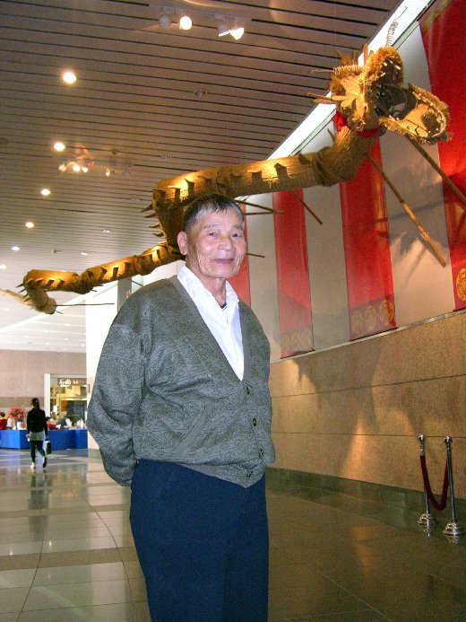 現年78歲王承德,5年前才開始學編稻草,主要理由是「好玩」,而且稻草還可以廢物利用,這尾騰空的「稻草龍」平日提供觀音鄉藍埔村民的舞龍隊使用。