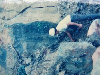今天再到本山礦場察看,這一大片被火藥紋身過的山壁,記錄了歲月痕跡。如果仔細看,當年火藥引爆後,埋炸藥處的火藥孔,如同牡丹花般,呈放射狀的排列著。