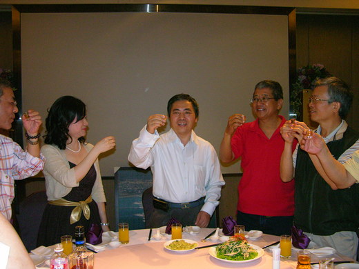會場裡的寒暄,約在十二時卅分告一段落,彩蝶宴的前菜上桌,地方中心準備的威士忌上桌,看到這麼多的好朋友,蕭主任打破自己不飲酒的慣例,率先站起來向大家舉杯致謝,他感謝同仁在系刊上對他的祝福,希望舉杯祝大家有更好的未來;刻意打扮的名主持人凌珮君開始發揮長才,帶動全場氣氛。