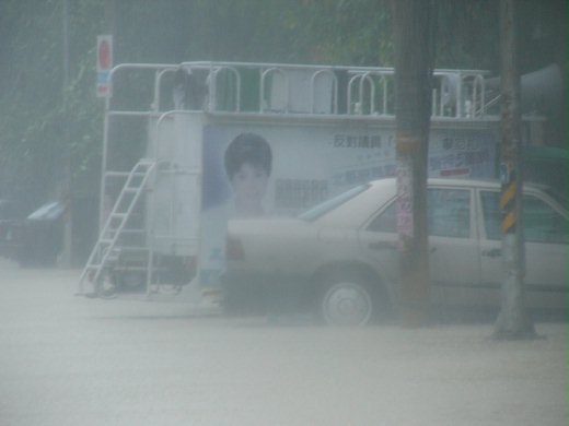 洩洪的關係,台南縣七股鄉城內、頂山、龍山一帶相繼失守,為了採訪工作,根本無法帶傘,此時穿雨衣、戴帽子,反而是最安全的裝扮。