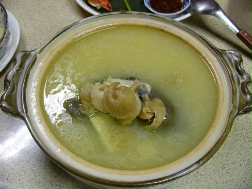 「阿娟」自己也研究料理,平常沒事就燉土雞,然後與魚刺等混在一起,熬出一個海陸總匯的一品鍋,是酒後回復精神的醒酒湯。另一道是醃製的珠螺,她的特殊醬汁,讓珠螺更美味。
