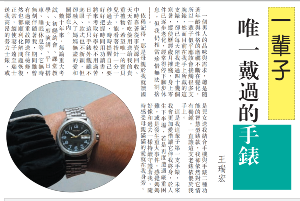 依稀記得,那是母親於我就讀國中時靠著從事資源回收、天天省吃儉用送給我的貴重禮物,希望唯一的寶貝兒子,能看著指針一分一秒過去,時時提醒自己要好好把握時間用功讀書,將來考取好學校不用過苦日子。這只手錶外觀雖不起眼、款式也不新穎,但卻融入了媽媽無盡的愛和關懷在內。