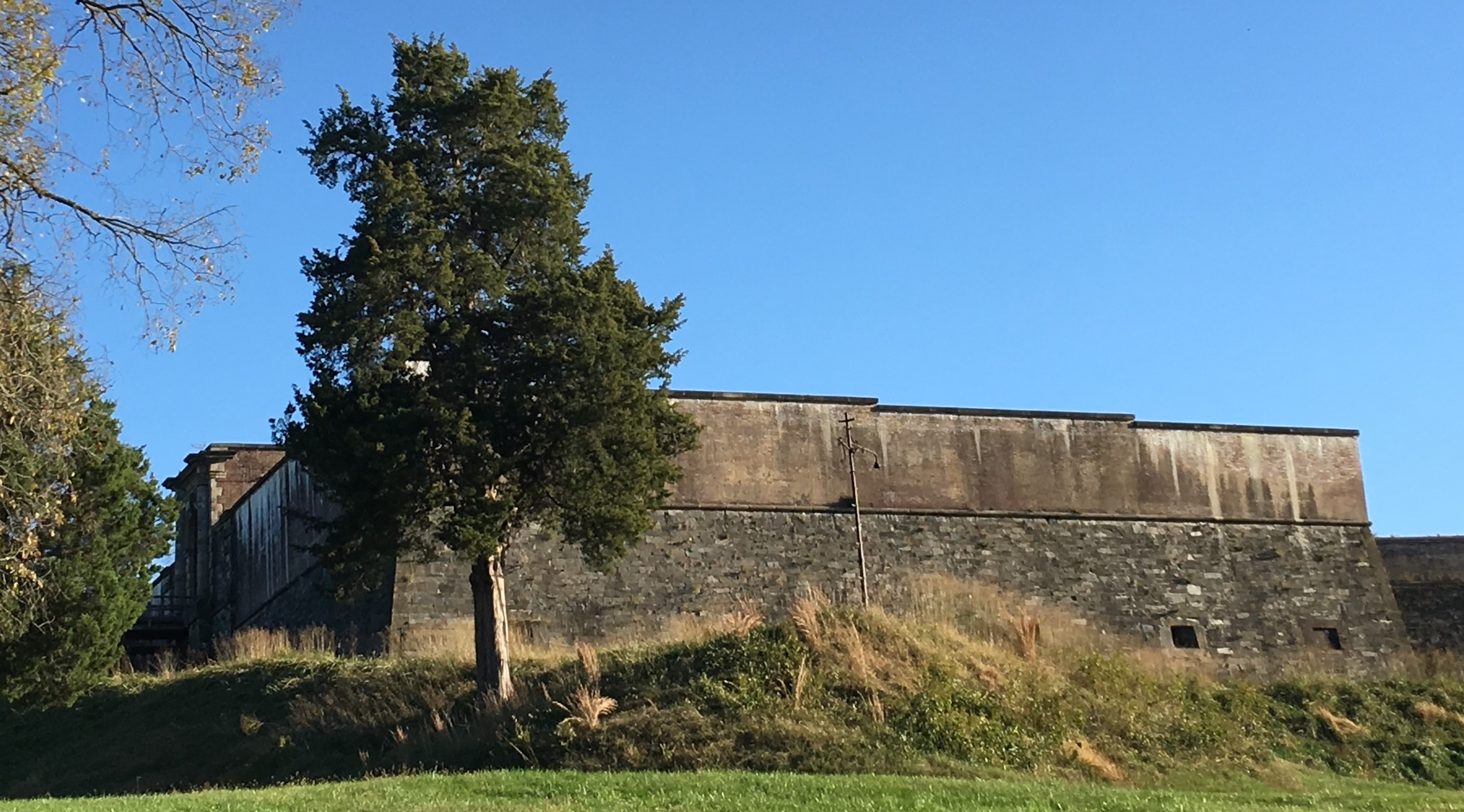 我到華盛頓堡時,停車場遠望過去,堡壘的門樓和牆面都已苔痕斑駁,房舍多已敗壞腐朽,只有環繞堡壘的城牆厚實雄偉依舊,城牆花崗石構築,高約二十公尺,有十餘公尺寬的壕溝。堡壘正門是寬五、六公尺的棧橋,棧橋前後兩段,後段可升起,戰陣可隔絕敵軍。城牆上置炮樓,有13座巨砲砲台。我踏入正門時,燦爛陽光正從內往外,將門沿鍍上一層金黃,映照著巨石堆壘的城牆,益顯其不可侵犯之勢。
