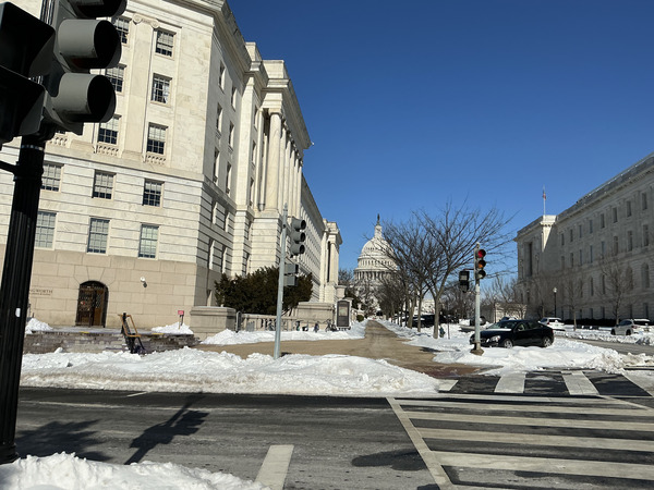 車站月台上,人人皆成臃腫的繭,不住跺腳、擺臂,以微小的抗爭抵禦嚴寒。銀線 (silver line)列車滑入時,車窗尚留冰花,彷彿整列車剛從凍土中掘出。駛近國會山莊 (Capitol South Station)站,平日車水馬龍的街道竟顯出罕見的寥廓,積雪吞沒了 所有 雜音,世界只剩列車碾過軌道的單調節奏。
