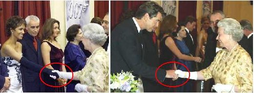 上面這張圖是英國女王接見電影007的男女主角的照片,圖中,可以看到男士與女士如何與女王握手,這乃是一個最標準的示範。