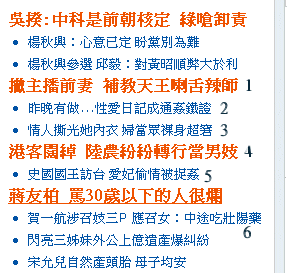 看上圖,是台灣「聯合新聞網」在我發文此刻的首頁頭條新聞。總共有六條「情色」新聞,其中還包括一條友邦元首的妻妾外遇新聞(這恐怕違反了外交禮節與慣例。)