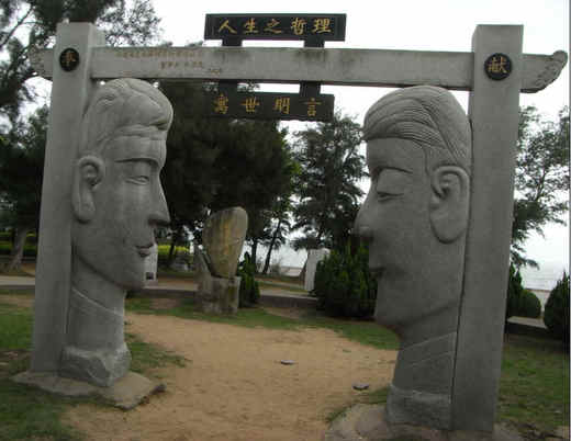 仿浮是一個諷刺的笑話,東拼西湊的石雕景相雜陳在崇島古城的海濱公園,有24孝,有水滸傳人物,及其五花八門的各種雕像雜陳,也擺置了這樣一個石雕門 : 人生哲理 ;這也是反應出大陸商業行為的一般雜亂素質.不過,整體來說,在這海邊散步感覺還算可以!
