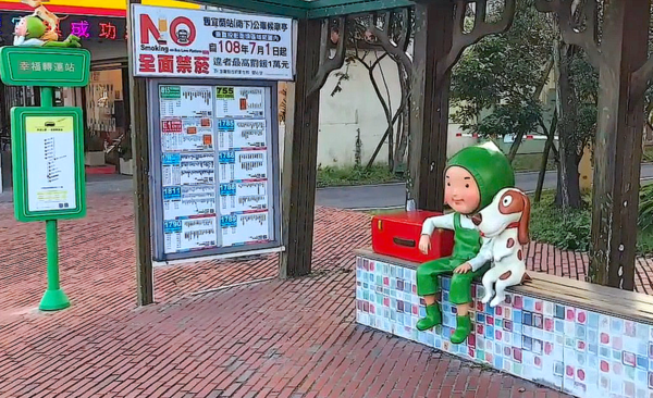 出現在《忘記親一下》中的「幸福候車亭」與座椅,形塑了小男孩小樹與他的狗狗布丁狗,一同等車前往鄉下探望外公的情景。沿途風景喚醒了記憶深處的溫柔片段,象徵旅途中的陪伴、思念與希望。「人生的旅程,每一次停靠,都是新的幸福。」
