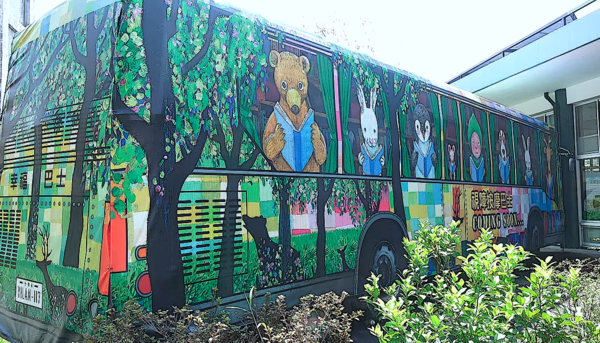 繽紛彩繪的靜態展示巴士,內部有幾米插畫,象徵幸福的移動旅程。