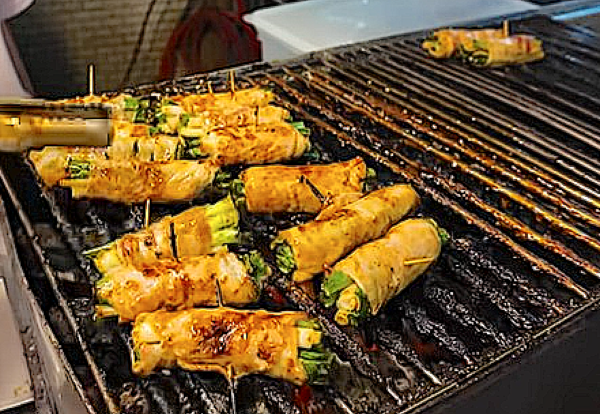碳烤三星葱肉串是許多夜市老饕會尋找的滋味。