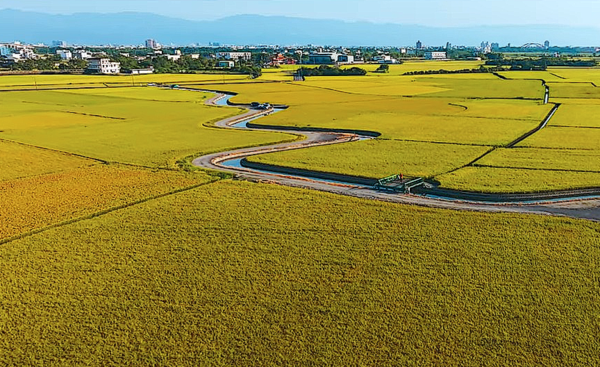 遠方,龜山島靜臥海上,恰如歷經滄桑的古靈,安然守望著這片沃土;近處,蘭陽平原金浪翻滾,阡陌縱橫,村落錯落,生機盎然。蔚藍天幕、翠綠田園與碧海波光交織成詩,天地間的氣息在此流動交融,繪就出一幅寧靜而壯闊的自然長卷。