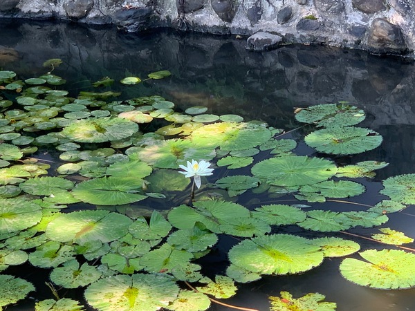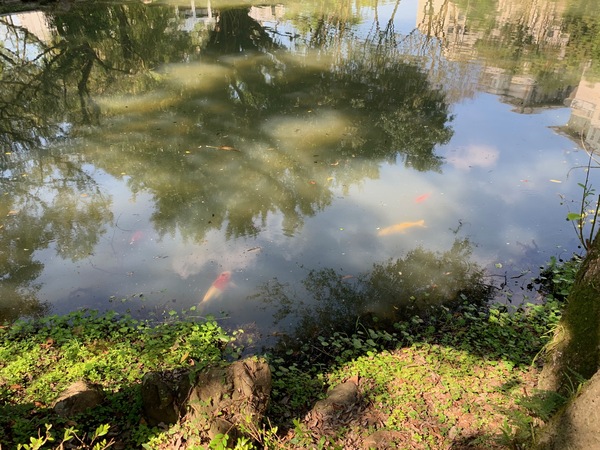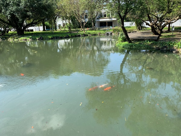 池塘周邊綠意環抱,濃蔭遮日,樹木的枝葉與水中倒影時而靜止如畫,時而隨風輕曳,不僅柔化了岸線,也為水中的游魚織就一片幽靜的棲息之地。常見錦鯉成群結隊,悠游自在,牠們身披橙、白、墨色的鱗片,在陽光透入水面的剎那,閃爍著點點流金。