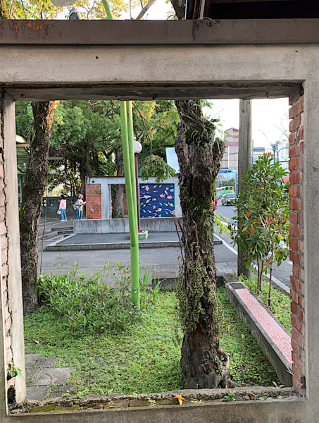 下圖呈現了園中一個極具詩意的角落。殘留的舊牆框架,宛如一扇「時光之窗」。窗內的老樹、青苔與磚牆,象徵歲月的痕跡與生命的延續;窗外則可見色彩繽紛的牆面與散步的遊人,彷彿提醒人們:生命的每一扇窗,都可能通往新的風景,走出過去、迎向希望。