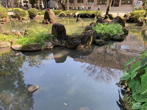 池中假山奇石錯落,水道蜿蜒曲折,整體格局彷彿一座隱於校園的「池泉廻游式」庭園,引人步入其中,俯仰皆景。