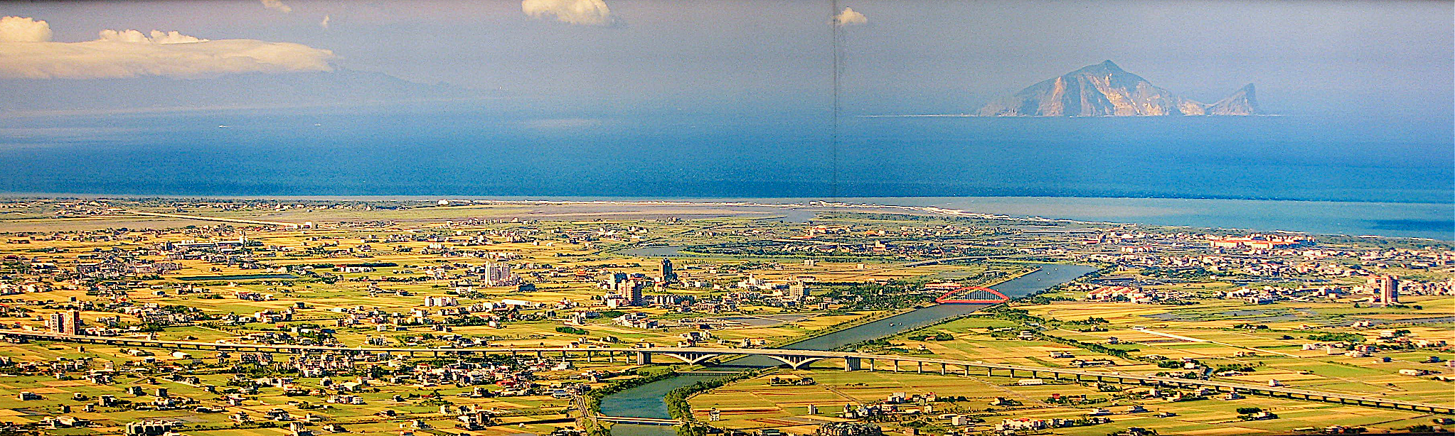 蘭陽平原,又名宜蘭平原、噶瑪蘭平原,面積約三百三十平方公里,主要由蘭陽溪長年沖積與地層抬升所形成,屬典型的沖積扇地貌。這片廣袤的田疇與承載著龜山島的湛藍海洋相互呼應。遙望之際,那龐然大龜彷彿正緩緩向陸地移動,似要登臨平原,與大地相依(見攝自蘭陽博物館投影的下圖)。此景令人心生寧靜,並油然生出敬畏之情。