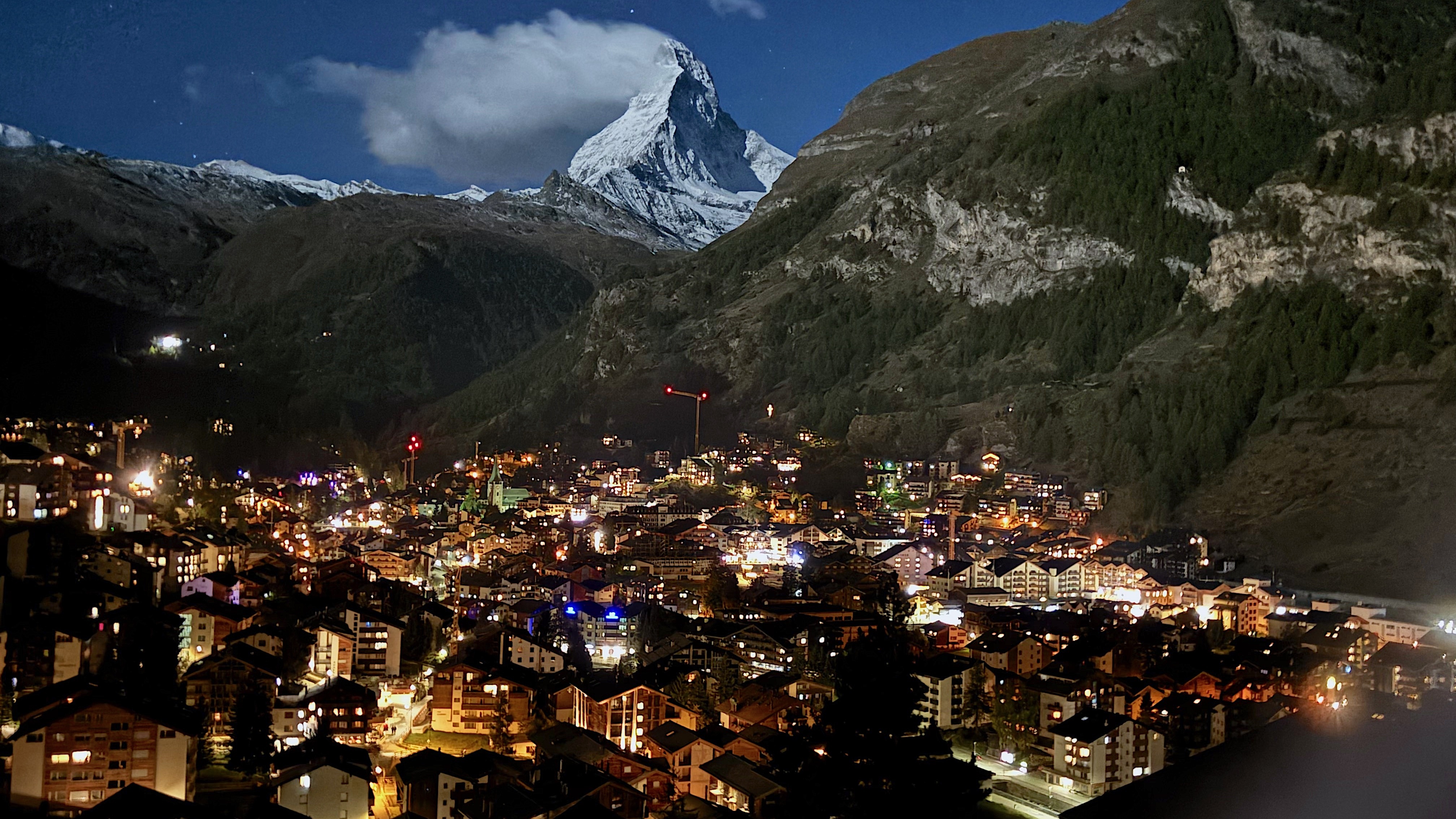 此刻的策馬特,恍若懸浮於天地之間——上有銀峰照月,下有星燈如夢。天與地,人與山,皆在同一片靜謐裡相互凝視。