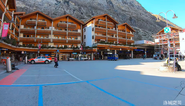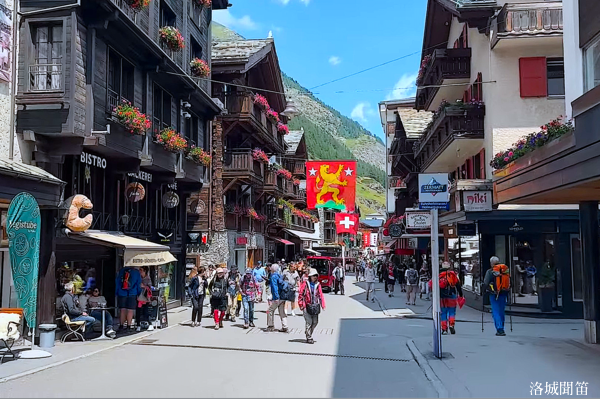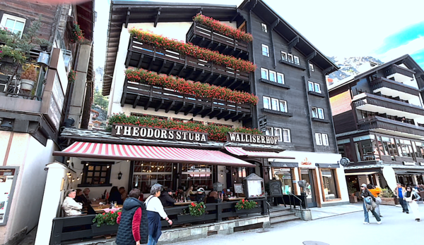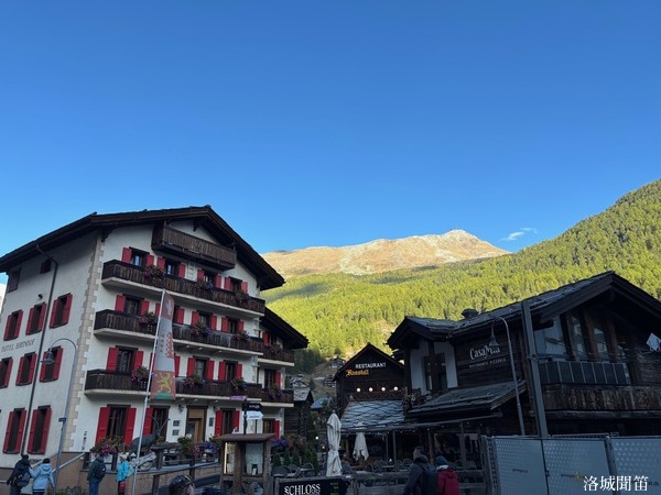 從策馬特火車站出來後僅右轉幾步,便來到鎮中心廣場 Bahnhofplatz。這裡是策馬特山鎮的心臟地帶,空間寬敞、視野開闊,是旅程剛到與即將離開時最直觀感受山城氛圍的地方。廣場四周由傳統阿爾卑斯木屋與石造建築環繞,屋頂傾斜、陽台擺放紅色花箱,展現瑞士山鎮典型的風格。地面為石板或平整磚面,一邊是人行步道,一邊是電動車或小型電動巴士的停靠點。廣場緊鄰策馬特的主要步行街 Bahnhofstrasse,其左右兩側分布滑雪及登山裝備租借店、瑞士鐘錶精品店、巧克力與紀念品店、咖啡廳與餐館。