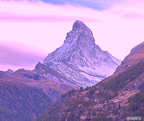 當黃昏靜靜降臨在策馬特山谷,天邊的雲被暮光染上一層柔和的玫瑰色,像遠古留下的溫柔餘暉,在寒意漸生的高山之間緩緩鋪開。馬特洪峰矗立在遠方,孤峻而不寒,巍峨卻沉默,彷彿在這天地交替的時刻,披上了一層神祕而莊嚴的光。
