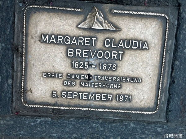 在聖莫里修斯教堂的附近,你會注意到地上的青石板路上,一塊塊刻著名字的石碑靜靜嵌在路面,那不是觀光裝飾,而是一條用生命故事鋪成的道路。每塊石碑一都刻有名字與生平事蹟,紀念那些在馬特洪峰與阿爾卑斯山殞落的登山者。譬如下列這位瑪格麗特·克勞迪亞·布雷沃特 (Margaret Claudia Brevoort, 1825-1876),是一位來自美國紐約的19世紀女子登山先驅。