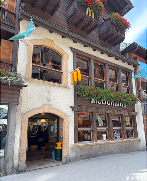 在策馬特,連麥當勞都帶著阿爾卑斯的氣質,像是藏身山城裡的一間木屋餐館。外牆用溫暖的木材與傳統山屋造型打造,與街旁的瑞士木屋旅館並肩而立,不顯突兀,反而成了策馬特街景中的一個自然存在。