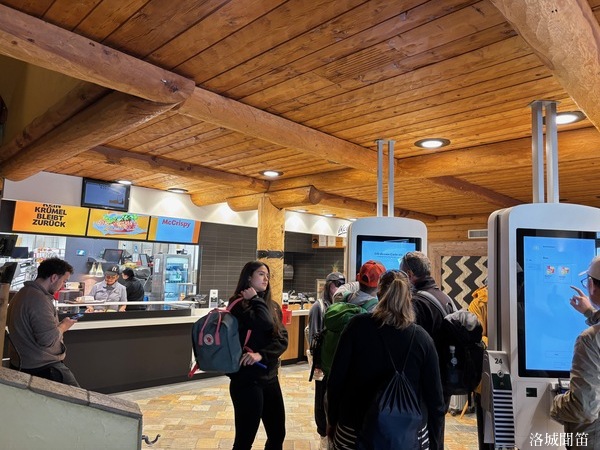 室內設計同樣保有山屋風格:原木覆蓋的天花板、木製桌椅、石牆點綴和簡約燈具。用餐時隔著大窗,望著街頭熙來攘往的登山客,使速食場域帶著度假悠閒感。人們端著熱氣騰騰的咖啡與炸得酥香的薯條,說著德語、法語、義大利語與英語,交織成世界旅人的短暫交會。這樣的麥當勞,讓用速食餐成為一種山中健行的休息方式。