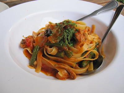 這紅醬乍看之下沒什麼,不過就是番茄醬嘛!愛吃義大利麵的人都知道,香甜可口罷了~ 所以俺毫不猶豫,大口大口,吸哩呼嚕吃將了起來... 老婆還笑瞇瞇的說我行啊,能吃辣了~ 不過漸漸地,額頭上的汗快比口水流得多了!! 雖然嘴裡越來越辣,但是怎樣就是停不下來! 每吸一口麵,帶進口中的辣味與香氣,就直貫到鼻腔裡,香辣的味道卻不見嗆鼻味,刺激著千萬個味蕾上,好像辣到受不了的時候,番茄的鮮甜味又悄悄地將豎立的細胞給撫平~ 停不下來! 只能大口大口把麵條吃光光,不過千萬要小心!在大口吞食的過程中,還會有大塊大塊的雞丁不時出現,還有鮮脆的豆子,都在妳不經意間蹦跳出來,讓嘴裡充滿了新鮮的好滋味~