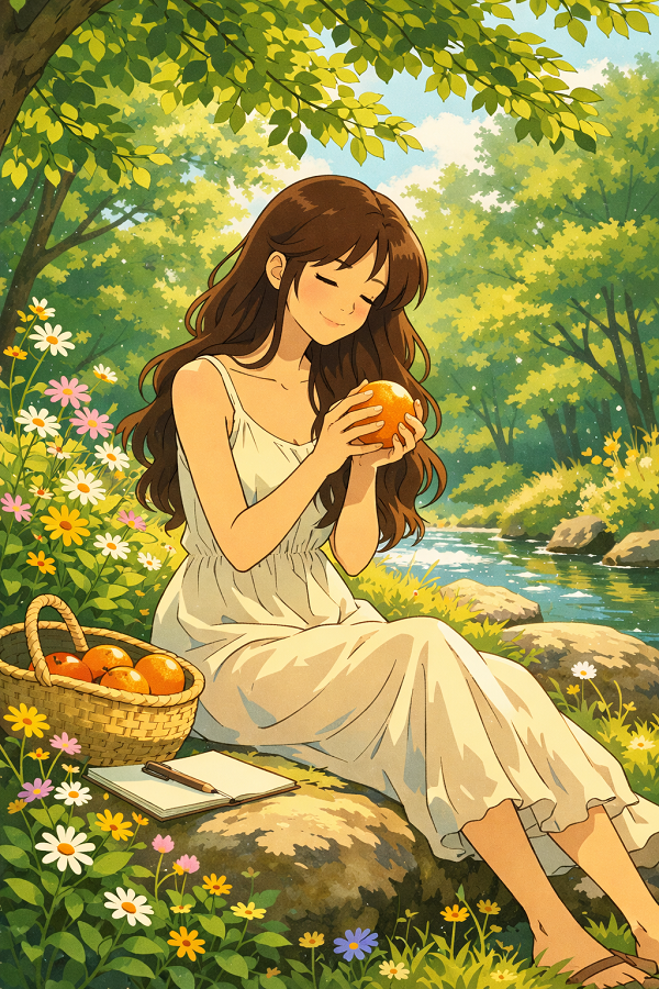 看見一顆水果安靜地躺在桌上,感受它完整而圓滿的存在。