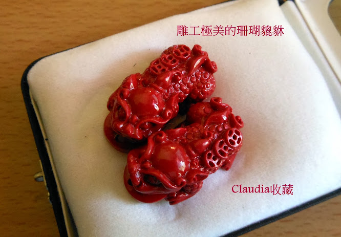 珊瑚貔貅項鍊串編 好友送我一對雕工好美的珊瑚貔貅 答謝我為她售出三對玉貔貅 她說這兩年貔貅在美國賣得很好 來買的客人大部分是老美! 這讓我很好奇貔貅到底是何方神聖 上網大致查了一下~ 貔貅(拼音:pi xiu,注音:ㄆㄧˊ ㄒㄧㄡ , 音同「皮休」),是中國古代神話傳說中的 一種神獸,龍頭、馬身、麟(麒麟)腳, 形狀似獅子,毛色灰白,會飛。 貔貅兇猛威武,喜吸食魔怪的精血,並轉化 為財富,因此許多現代人將牠做為手鍊, 希望能招財,並說它在天上負責的巡視工作, 阻止妖魔鬼怪、瘟疫疾病擾亂天庭。 但其說法並未見於古代文獻中。 辟邪是獨角的, 亦有雙角的,這是很多人 都知道的, 但是, 如果細分, 獨角的名 辟邪, 雙角的名為天祿。 相傳貔貅是龍生九子之一。 貔貅分為招財和守財兩種。 一般掛件則應選擇招財, 而家中擺設則應選擇大件守財。 [摘自維基百科]