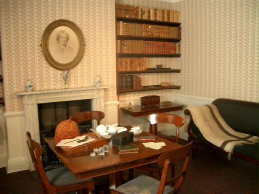 博物館裡展示牧師居所當年的擺設,和勃朗特家人的私人用品及畫像,每一項文物旁都有詳細的說明,連很難看懂的手稿都有打印清楚的版本可以參照. 在此之前我對勃朗特三姐妹其實了解得不多,雖然讀過她們的小說,也做過”咆哮山莊”的報告,但是都是片面不完整的了解.這是第一次在有這麼多文物和解說的環境裡把她們的生平串聯起來,並且和各自的文學作品做對照,我越看越覺得有意思,不知不覺的裡面耗了很久,直到工作人員來召集大家到大房間看一個穿著19世紀仕女服的解說員講解”簡愛”中Jane在不同時期的服裝.或許是由勃朗特三姐妹的愛好者集資設立的博物館,館內的活動和資訊都讓人感到對細節的用心.