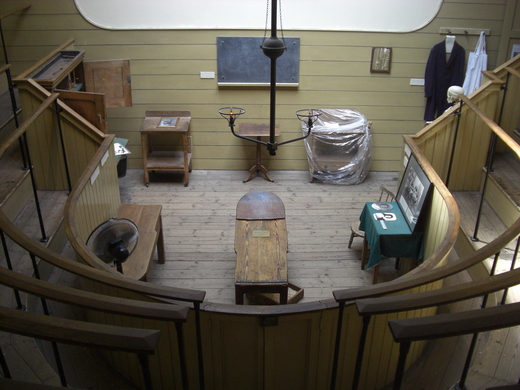 這是倫敦的Old Operating Theatre,是過去麻醉藥還沒發明時醫生動手術的地方. 旁邊的看台是給醫學生實習用. 麻藥還沒發明的年代動手術是大事一件,而且常常出人命(大概都是痛死的吧?!),開刀檯旁還有文字說明當時地上放滿乾木屑,為的是吸檯上流下來的血,以免血滲透到樓下的教堂屋頂.