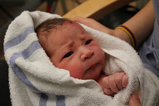 睡睡醒醒之間,我感到自己被從病床移到產台,兩腳用皮條綁緊,整個人像犯人一樣五花大綁架得高高的. 主導手術的是一個年約四五十歲的德國女醫生,術前她很親切的對我講解接下來會發生的事情,我大概知道免不了被剪一刀,卻已經累到沒辦法覺得害怕. 不知道過了多久(後來看手術紀錄其實只有幾分鐘而已),我從昏睡中醒來,感覺那刀下去卻不會痛,同時醫生叫我開始推寶寶出來. 強力的麻醉讓我一點痛覺也沒有,當然也感覺不到怎麼用肚子的力量,我只能照醫生說的,想像自己要上一號那樣用力的推.