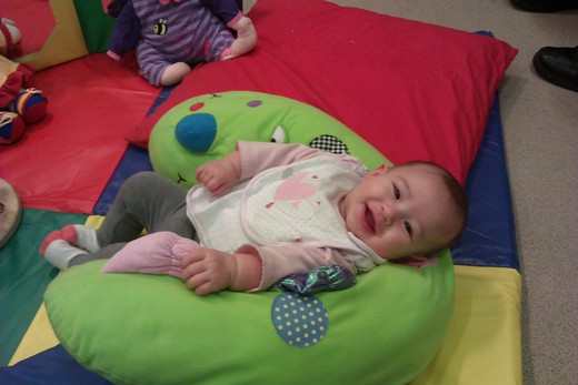 平日要上班,小包和Nina相處的時間不如我多,因此他在家我就盡量讓他帶女兒,除了不能餵奶,洗澡換尿布等等他都很上手(不過幫Nina換衣服偶爾會因為搞不清楚女生衣服怎麼穿而穿錯)。每天晚上,他最享受父女兩人的浪漫時光 -- 一起躺在沙發上看電視 -- 不過他總是沒多久就把電視按暫停,專心的跟他口中"全世界最可愛的女兒"玩起來了。通常這個時候,我會趁機去洗臉刷牙,準備晚一點接手送Nina上床,不過大概是爸爸玩的遊戲比較激烈,Nina 常常玩沒多久就累了開始哭鬧,這時小包就得想新花招來討女兒歡心。