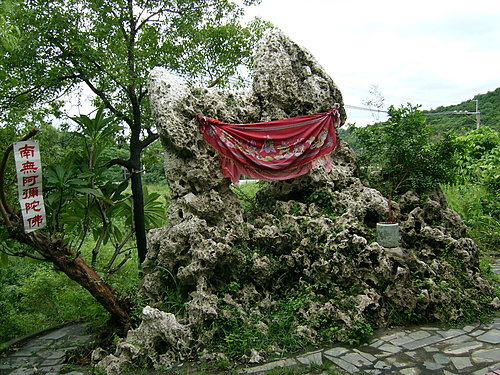 小時清水寺不但是林園地方上的主要信仰中心,也影響到大寮鄉昭明等地。每次大拜拜都人山人海,那時小孩的我只看見寺的山邊小道,善男信女絡繹於途往來,皆言:去給石頭公做「客子」。其實路途並不遠,或許家族並不信這一套?所以小時候我只聞石頭公的名未見其影。及長好像祂的名氣沒那麼大,石頭公沒落了!其實此地景十分奇特,這附近是林園鄉境「七大古蹟」遺址中的:「天明園遺址」之所。據傳這裡早期曾是處決人犯之地!日治時代有地道通往山頂,對面山頂名為「獅喉」,有言:「獅喉吐火東港必遭回祿之災!」據傳古早「獅喉」會吐火,當它吐火時對面東港就會「火燒厝」,就在這裡。其下乃存寬敞日據戰被坑道碉堡、洞口,深具探險奇麗美感。十年前我曾從「龍蟠洞」南向出口,再走山開道可登「獅喉」,再走坑洞下山,非常刺激。