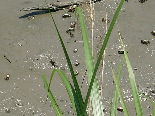 我們參訪「北淡水」紅樹林只有三小時的時間,徒步在淡水紅樹林區規劃完善的參觀步道上,和自行車道間。這裡都是原生自然純林非常茂盛的「水筆仔」純林,已經五月了的花期已經開始,但「胎生苗」乃有少數附著母株上;不像「下淡水」人工復育的「水筆仔」,水土不服不易長大存活!差不多三月「胎生苗」皆已掉光。然而這裡的濕地大部份乃在漲潮線下,故乃能保持原貌濕地功能。但高屏溪口濕地則泥沙淤積「陸地化」傾向與日增高,可能喪失濕地特性?將減損「紅樹林」的生命力。因此適合陰涼北部氣候的「水筆仔」,在溫熱的南部生長延伸至高屏溪口,其實生存已非常不容易!不過屬於南部熱帶特有種「海茄苳」則生命力特別旺盛,欖李、五梨跤的生長也都還不錯。