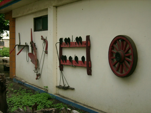為了不損及大片庭院綠地,後來只在右後十多坪豬舍改建為現代化衛浴廚房和車庫。也將祖先遺留下來的犁、割耙、手耙、牛車輪等農具上漆後掛在車庫外牆上,別是一番滋味在心頭。這種農宅根本不用交繳房屋,地價稅!直叫那些住「樓仔厝」者看呆了!