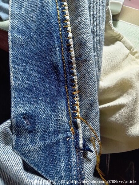 這件的牛仔褲拆除後的邊布料,收邊的布料沒有辦法再用機器車合。