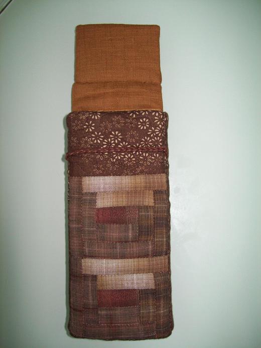 這件作品我設計用小木屋的圖案,且布料採用耐看的先染布,一針一線的縫製,ㄧ片一片的縫合,還有採用皮繩的編織,顯示出成品的古樸,加上古典美的作品是我創作的心意!