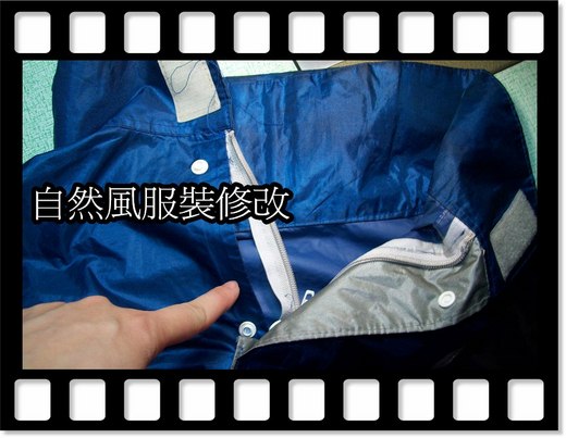 他的雨衣領口下方拉鍊脫線,並且他想要多加一片魔鬼氈,這樣比較不會漏雨進入。