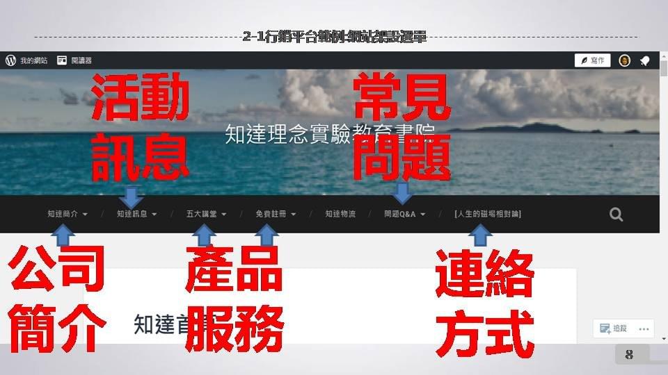 平台要有哪些內容?讓我們的消費者或潛在客戶看到。大致有五項選單,『公司簡介』、『產品說明』、『活動訊息』、『常見問題』、『聯絡方式』...